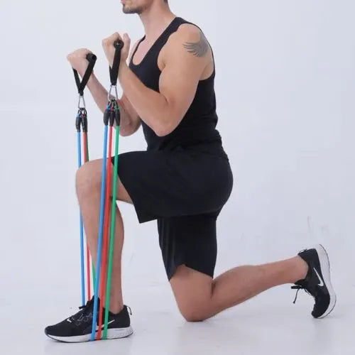 El set incluye 5 ligas tubulares, cada una con diferente nivel de resistencia (por ejemplo: 10 lb, 20 lb, 30 lb, 40 lb y 50 lb).